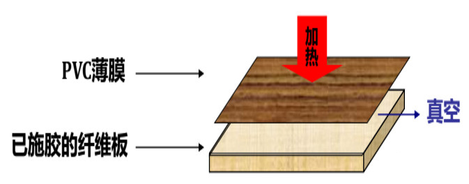 PVC膜与施胶后的纤维板贴近,利用真空抽走PVC膜和中密度纤维板胶膜间的空气,(压力0.8MPa时间60s-90s)使PVC膜紧紧地粘贴在中密度纤维板上,出吸塑机后板面温度应在80 -90 ℃