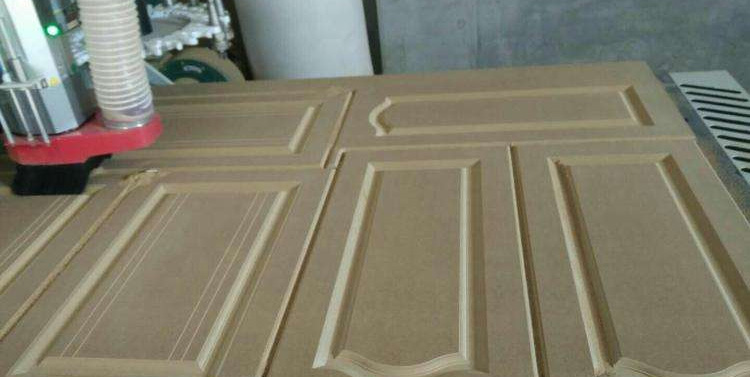 将PVC薄膜裁剪盖于纤维板面,进入真空吸塑机。加热(温度在120-200℃,时间在30s-