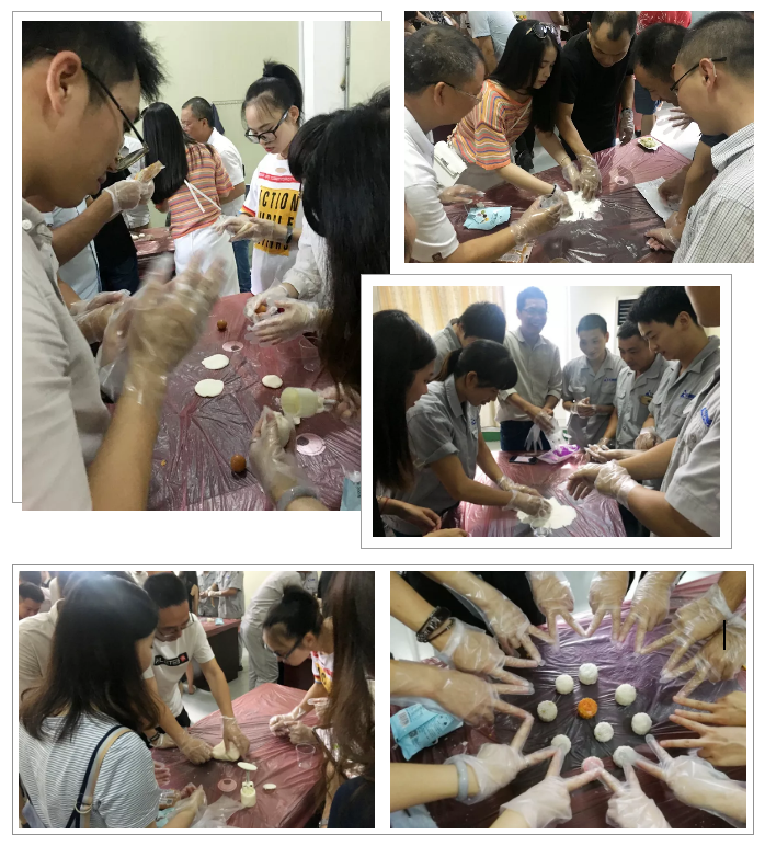 Part②手工制作月饼:细心的人事行政部同事们为大家准备了制作冰皮月饼的材料,大家一起手工制作月饼,分享美食。