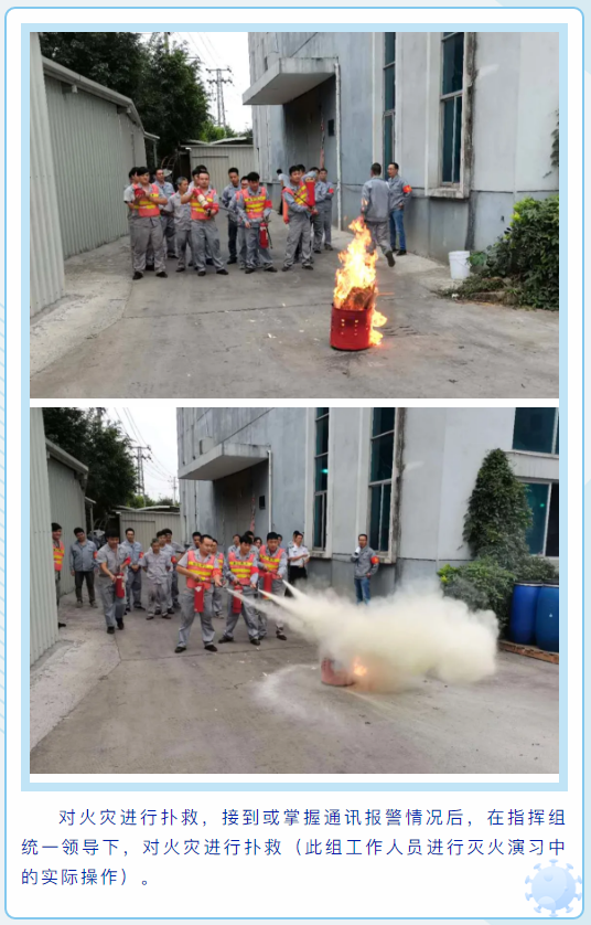 演练目的:为了提高全公司职工的消防安全意识,掌握消防安全知识,全面落实消防安全责任,进一步提高公司消防安全应急处置能力。落实“消除事故隐患,筑牢安全防线”为主题的宣传活动通知精神,当公司发生紧急情况时,各部门,职工能够按公司预案“处理火情和紧急疏散人员,沉着有序处理,熟悉并掌握公司火灾时的紧急行动程序和疏散路线,及时传达并迅速组织救援逃生。熟练掌握逃生时的基本知识,增强自救互救能力,最大限度的保障人员和财产的安全。”
