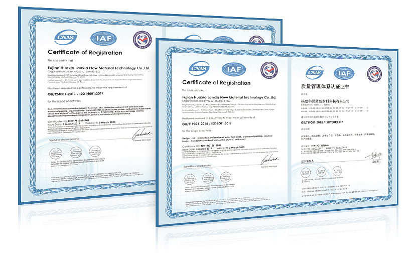 华夏蓝生产和研发管理体系均已通过ISO9001与ISO14001环境管理体系认证。