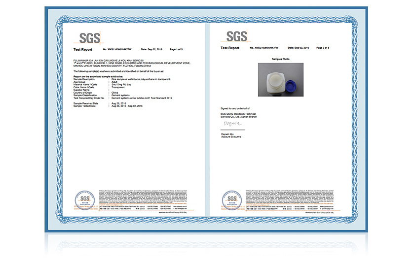 华夏蓝科技水性鞋胶于2016年9月2日通过SGS质量检测,SGS是全球领先的检验、鉴定、测试和认证机构,是全球公认的质量和诚信基准。